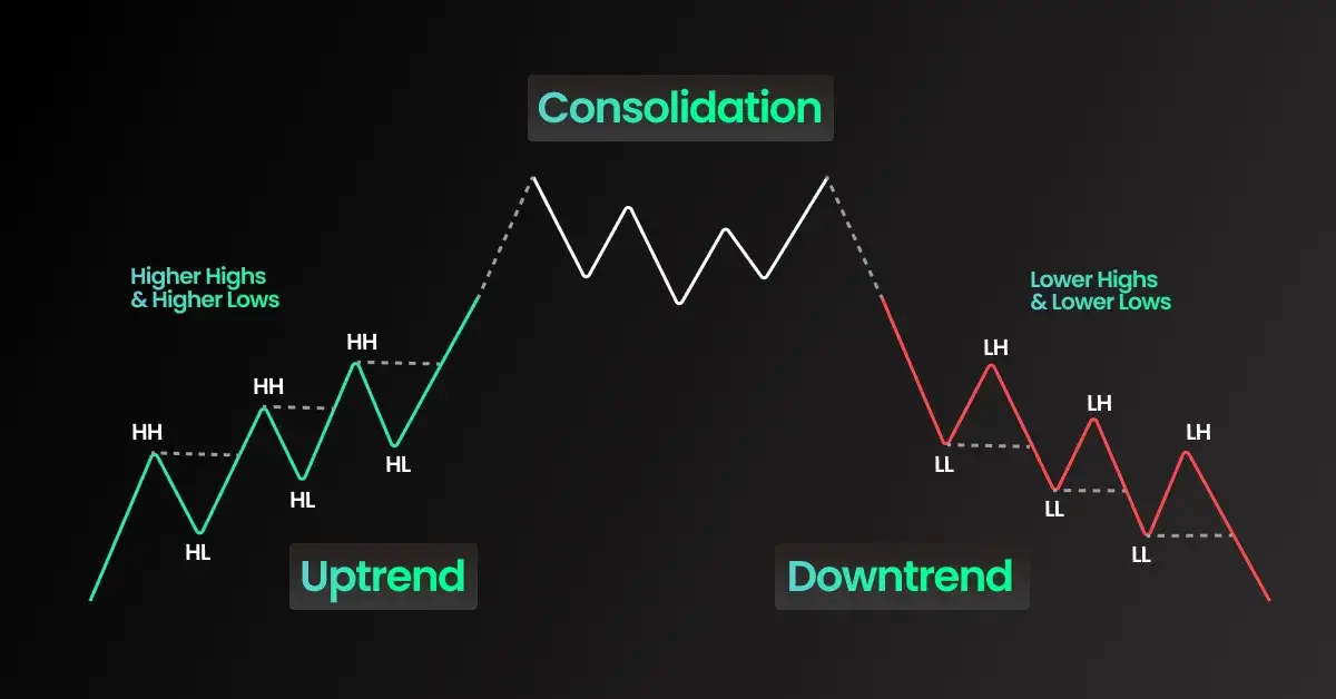 Market structure refers to the trend of price movements over time. Traders classify price action into three main phases: